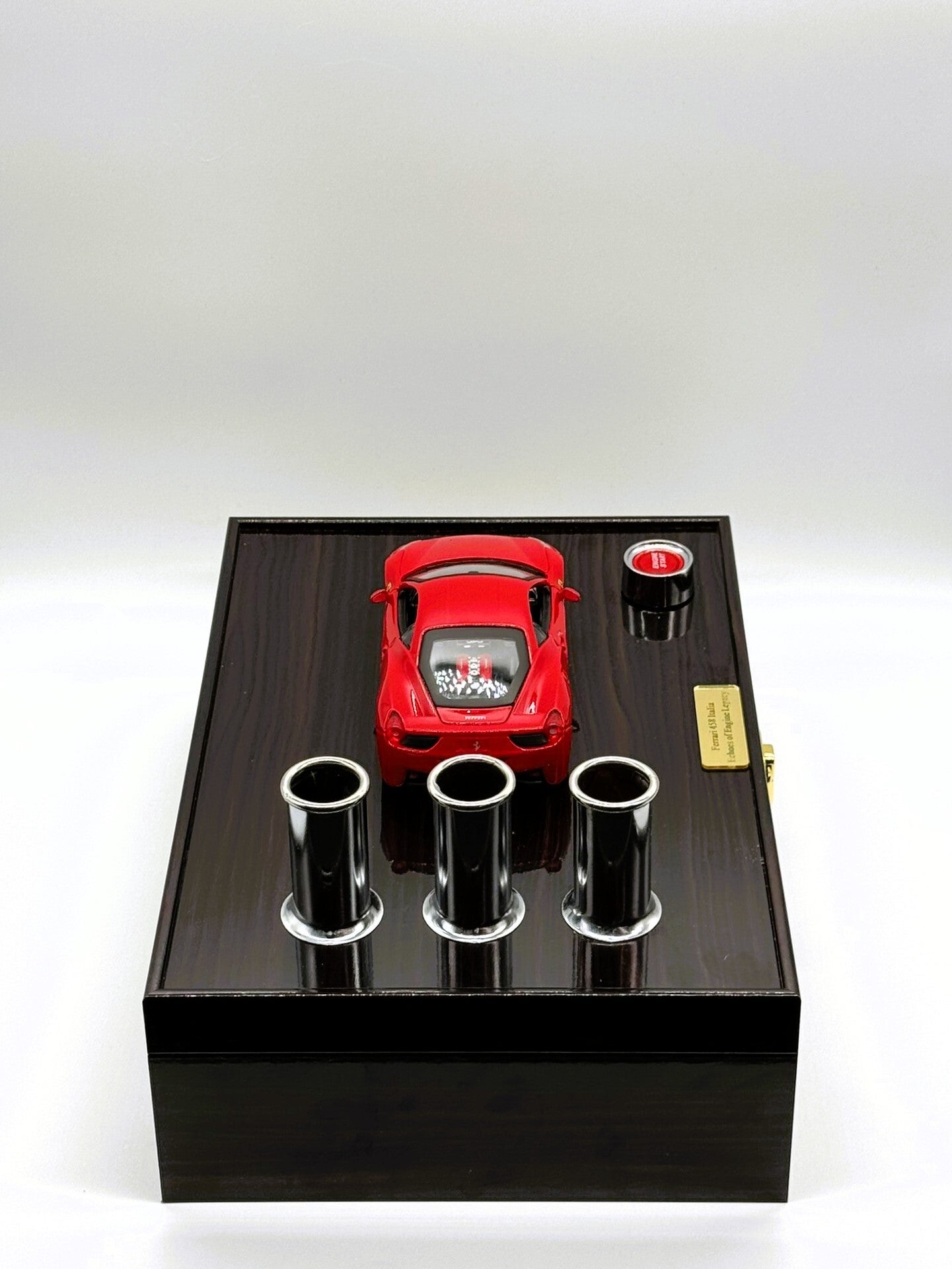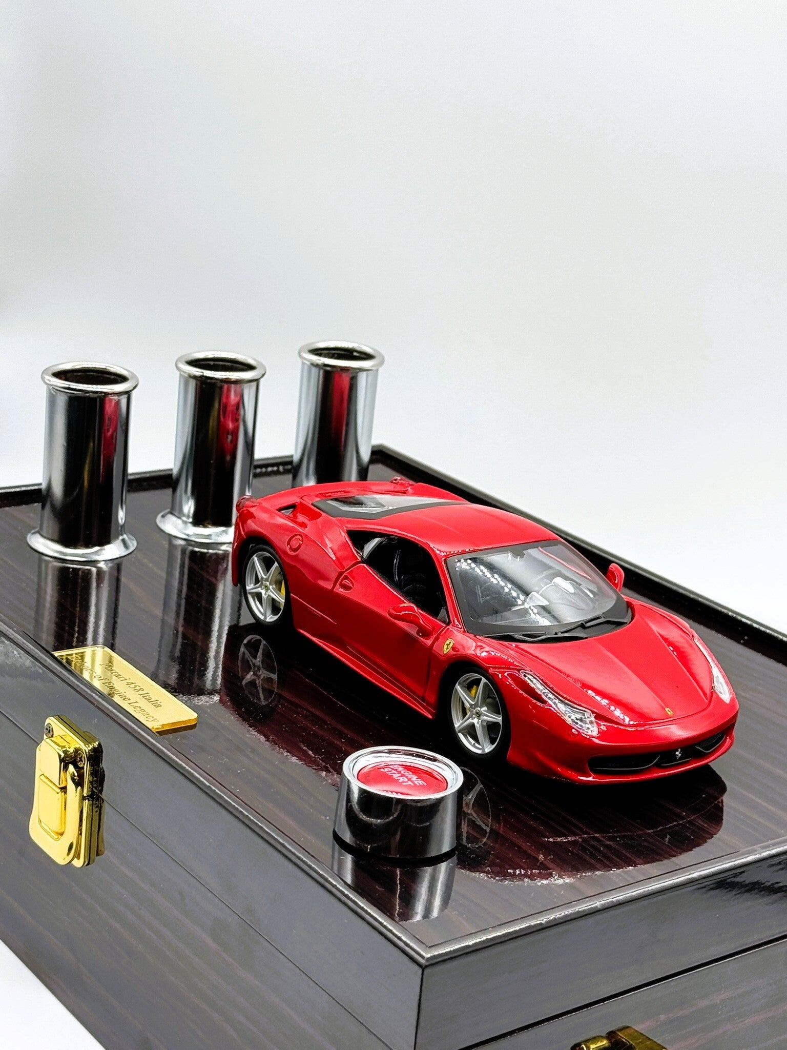 Handmade Wooden Stand – Piano lacquer finish with matching Ferrari exhaust design.