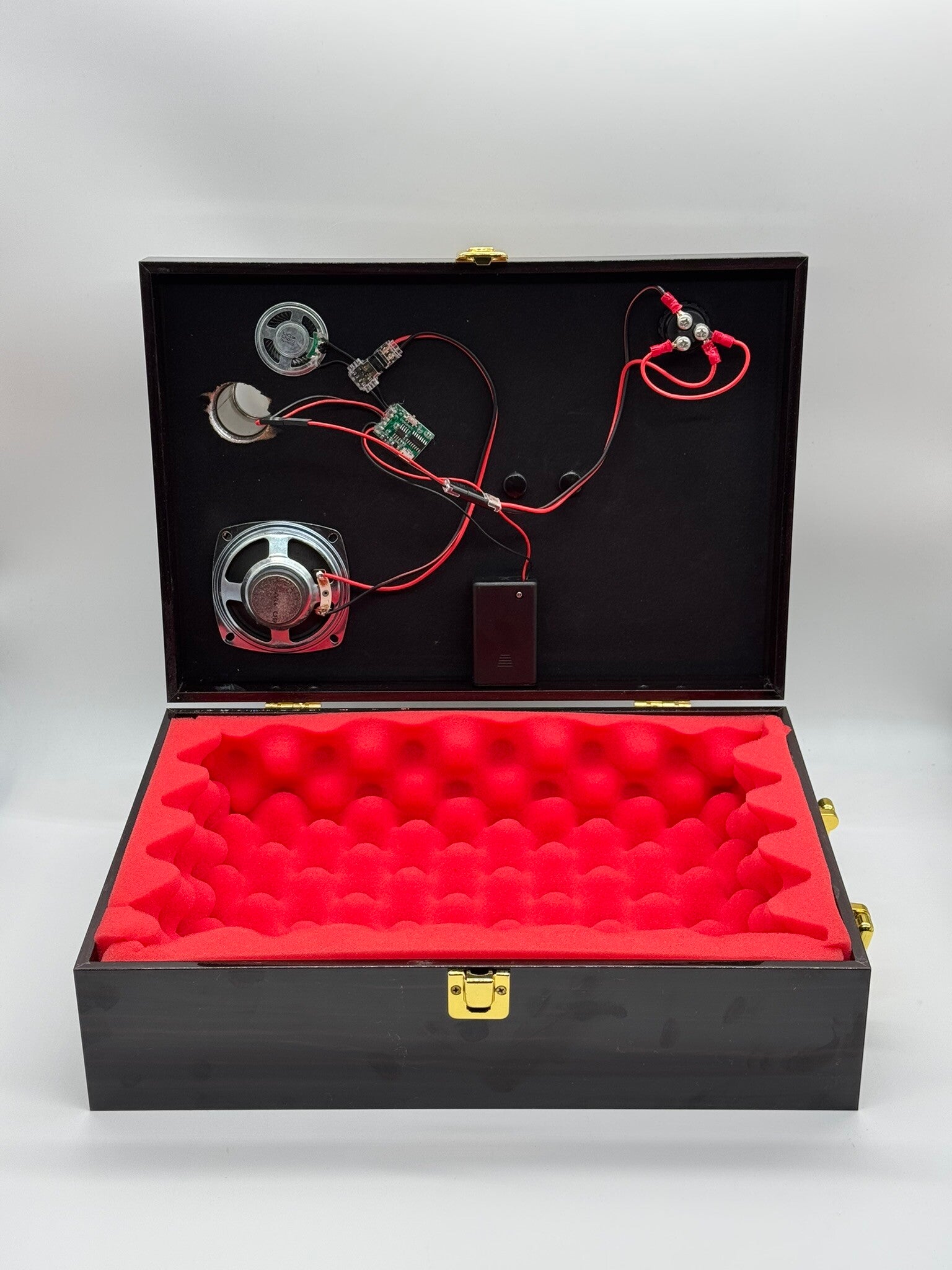 Activate sounds using the integrated start button. Each audio file has been mixed and mastered for rich, room-filling performance tailored to the display’s internal acoustic chamber.