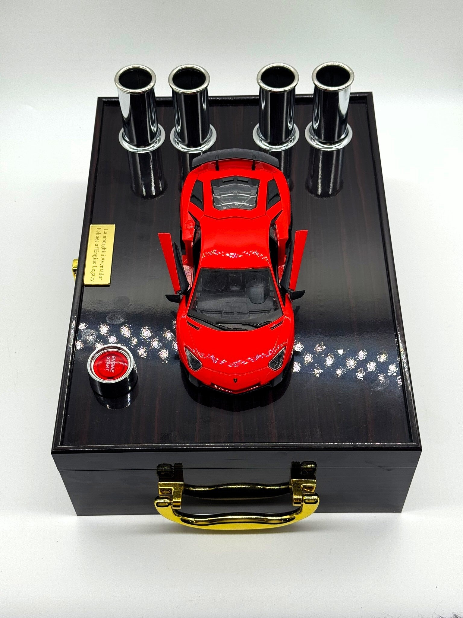 Feel the roar of the Lamborghini Aventador SV’s V12 engine with authentic, high-quality recordings. This handcrafted display comes in a piano-lacquered wine box, featuring a start button, dual speakers, and an exclusive voice-over narrating the car’s rich history and stunning performance.